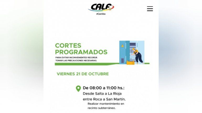 Operarios de la cooperativa Calf volverán a cortar el servicio de energía eléctrica para hacer trabajos. El corte programado será este viernes, entre las 8 y 11 de la mañana, en pleno centro de Neuquén. Concretamente, se informó que el suministro será interrumpido desde la calle Salta hasta La Rioja, entre Roca y San Martín.