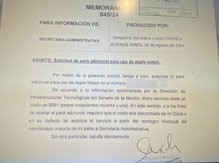 En la nota que lleva su firma y que lleva como asunto: "solicitud de pack adicional para uso de Apple Watch", la senadora solicitó que le autoricen el pack adicional para el uso de este servicio con su número de celular, un trámite que cualquier persona puede hacer personalmente con su empresa de telefonía. Lo insólito del pedido es que tiene un valor de tan solo de 991 pesos.
