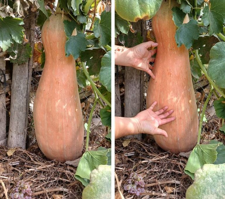 Pero la sorpresa, sin dudas, fue el zapallo tipo calabaza que cosecharon hace poco de la planta. Pesa aproximadamente 16 kilos y mide 90 centímetros. "Es la primera vez que saca uno así", dijo la vecina Dina.