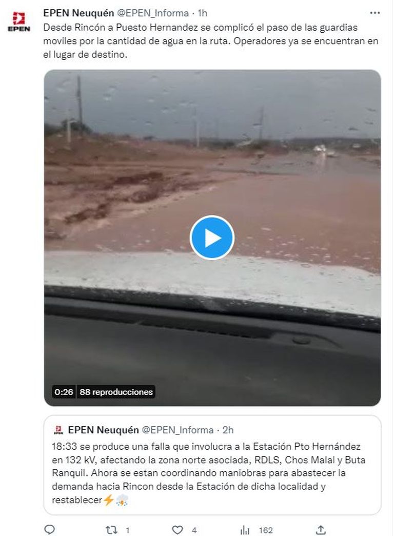 A causa de las fuertes tormentas la Estación Transformadora Puesto Hernández salió de servicio y dejó sin energía eléctrica al menos a tres localidades del norte de la provincia de Neuquén. Pese a lo difícil de trabajar con las actuales condiciones de inestabilidad, el personal del Ente Provincial de Energía de Neuquén (EPEN) avanzaba en el restablecimiento del servicio.