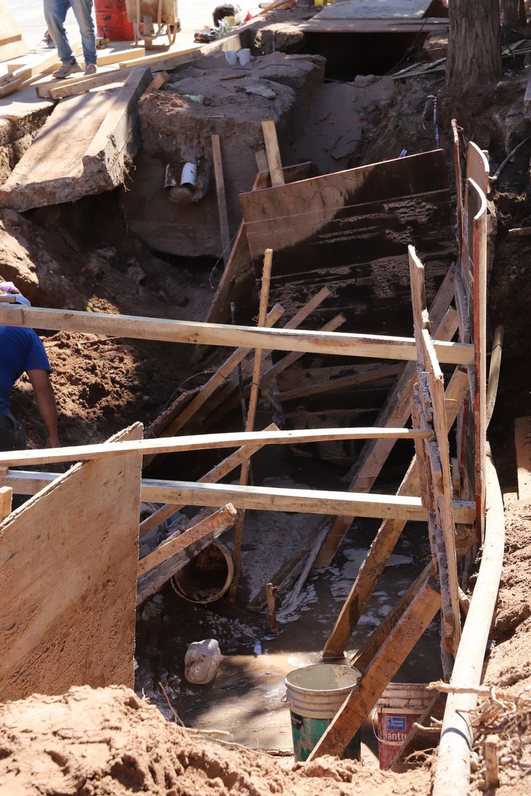 El caño roto generó una gran pérdida de agua y la aparición de un socavón en el sector, comprometiendo la estabilidad de una columna de hormigón correspondiente a una línea de Media Tensión de CALF.