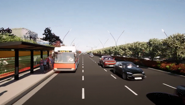 La transformación vial será profunda: cuatro carriles por mano, estacionamiento, bicisendas en ambos sentidos, espacio verde longitudinal y veredas amplias de cinco a seis metros con una arquitectura moderna y uniforme. El corredor verde tendrá un impacto significativo: acumulado a lo largo de los catorce kilómetros, equivaldrá a 25 plazas de una cuadra, con arbolado urbano diseñado por especialistas.