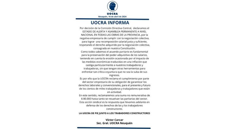 Tras la decisión del gobierno nacional de suspender las obras públicas en todo el país, la UOCRA se declaró en estado de alerta a nivel nacional para exigir el cierre del acuerdo paritario del mes de abril y así conseguir una actualización salarial para los obreros de la construcción.