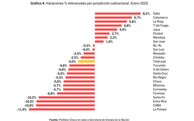 “En enero, 8 de las 24 jurisdicciones subnacionales presentaron subas interanuales: en el podio se ubicaron Salta (8,2%), Catamarca (6,7%) y La Rioja (5,8%) y más atrás le siguieron Tierra del Fuego, Jujuy, Chubut, Mendoza y San Juan”, señala Politikon.