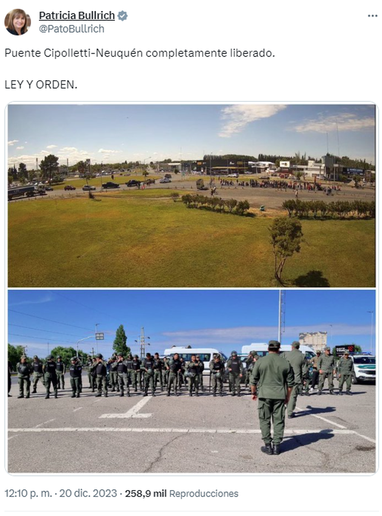 "En coordinación con la Fiscalía Federal y el Juzgado Federal de Río Negro, así como con la participación del personal de la Gendarmería Nacional, se ha ejecutado un operativo de prevención en cabeceras de puentes interprovinciales, con la afectación de efectivos para garantizar la seguridad y el orden en la región", continúa el escrito de la cartera encabezada por Bullrich.