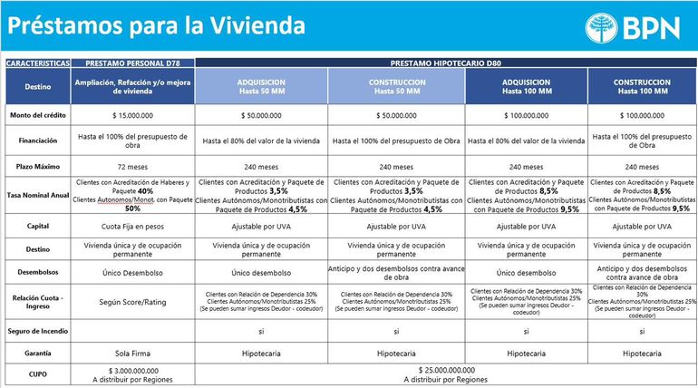Por último, habrá financiamientos para ampliación, refacción y terminación de vivienda. Será a través de la modalidad de préstamo personal a través de los canales habituales, con un plazo de hasta 72 meses y un monto máximo de 15 millones de pesos. Las tasas de interés serán del 40% para quienes tengan acreditación de haberes en el BPN y del 50% para quienes no.