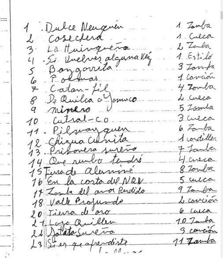 Viento Sureño (el segundo loncomeo que escribió Berbel), Loncopué, Será porque soy neuquino, Volver a Chos Malal, Triste Limay, Raíz de Piedra: los nombres de las canciones que el más pequeño de los hijos de Marité compuso junto a su abuelo, llenan páginas.