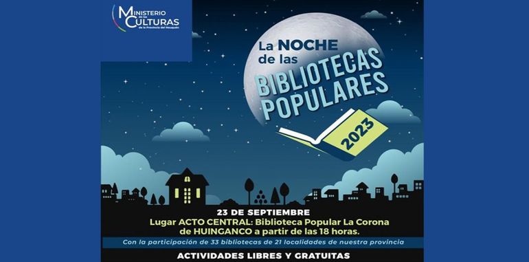 Se celebrará este sábado la 5ª edición de La Noche de las Bibliotecas Populares. Según se anunció oficialmente, en el acto central, la Biblioteca Popular La Corona, de Huinganco, compartirá con la de la vecina localidad de Andacollo.