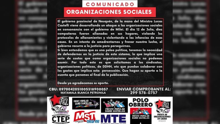 "El gobierno provincial de Neuquén, de la mano del Ministro Lucas Castelli viene desarrollando un ataque a las organizaciones sociales en consonancia con el gobierno de Milei. El día 12 de Julio, diez compañeras fueron allanadas en sus hogares, violando los protocolos de allanamientos y violentando a las infancias de esas casas. En un intento de amedrentarnos y frenar nuestra lucha, el gobierno recurre a la justicia para perseguirnos", afirmaron.