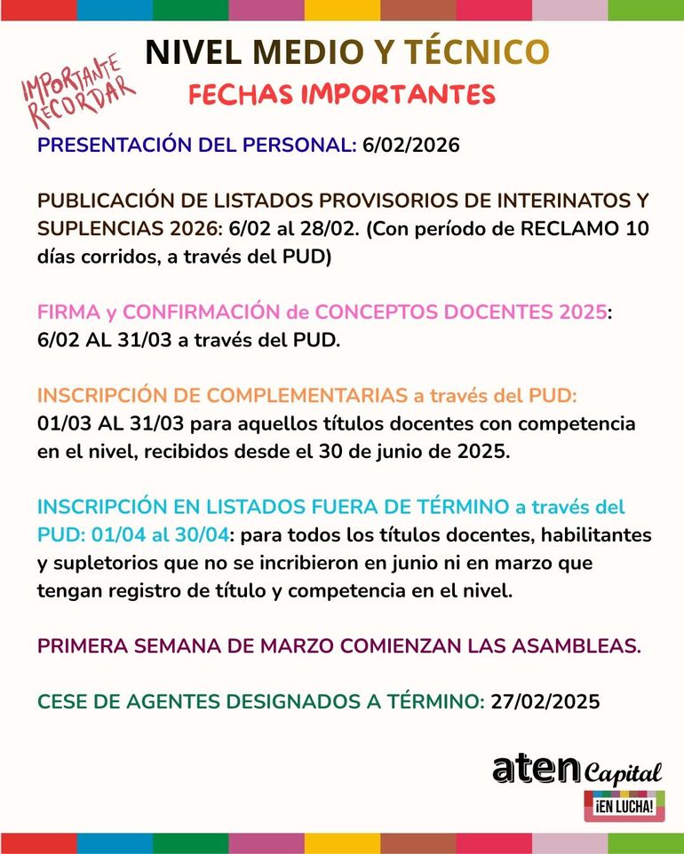 La inscripción en listados fuera de término será del 1 de abril al 30 de abril. La primera semana de marzo comenzarán las asambleas y el cese de agentes designados a término es el 27 de febrero.