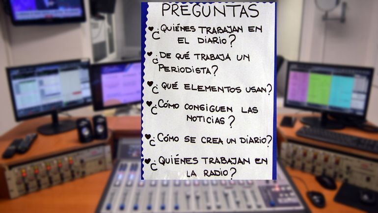 Como parte de la actividad, los chicos elaboraron una serie de preguntas que presentaron en un afiche para que los periodistas respondieran. Esa tarea la habían trabajado en clase.