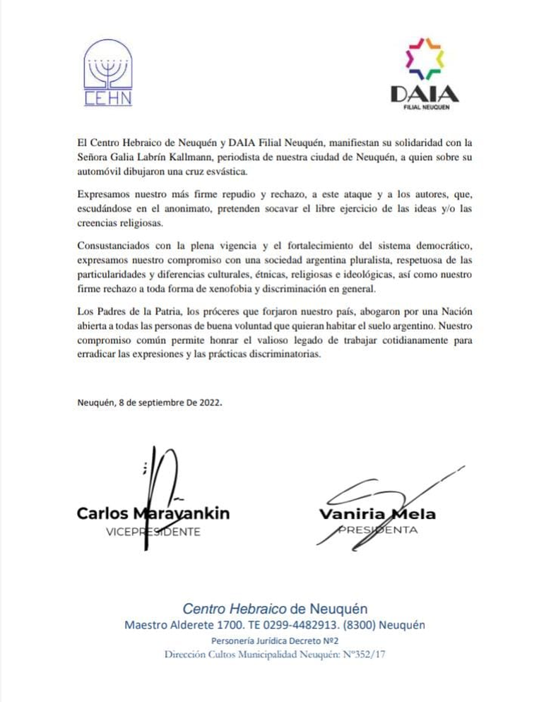 También el Centro Hebraico de Neuquén y DAIA Filial Neuquén manifestaron su solidaridad con la periodista de esta ciudad. “Expresamos nuestro más firme repudio y rechazo a este ataque, y a los autores, que, escudándose en el anonimato pretenden socavar el libre ejercicio de las ideas y/o las creencias religiosas”, expresaron en un comunicado.
