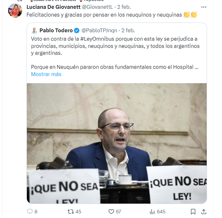 Todero había justificado que "voto en contra de la Ley Ómnibus porque con esta ley se perjudica a provincias, municipios, neuquinos y neuquinas, y todos los argentinos y argentinas".