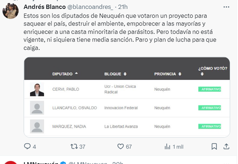 Finalmente, el diputado provincial por la izquierda, Andrés Blanco, consideró que Márquez, Cervi y Llancafilo "son los diputados de Neuquén que votaron un proyecto para saquear el país, destruir el ambiente, empobrecer a las mayorías y enriquecer a una casta minoritaria de parásitos".