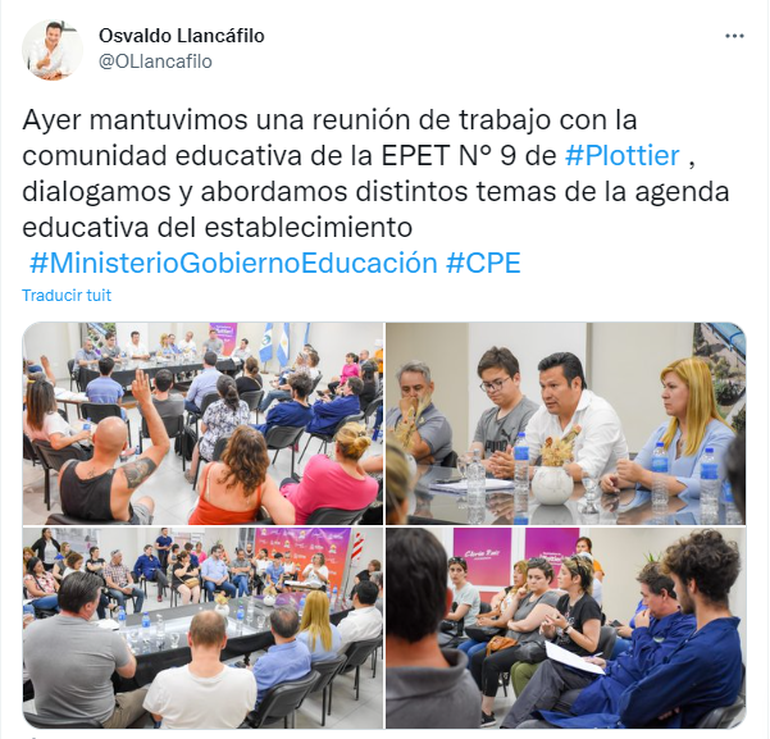 El funcionario provincial explicó que en la reunión mantenida el martes en Plottier se busco dar solución al requerimiento de la comunidad educativa que cuestiona el turno vespertino. “Esta es una propuesta que ha hecho la dirección de nivel técnica del Consejo Provincial de Educación (CPE), así que mantendremos una nueva reunión para evaluar la propuesta que se hizo y poder consensuar con la comunidad educativa como se va a llevar adelante en todo caso los turnos en la EPET 9 en el ciclo lectivo 2023”, señaló Llancafilo en declaraciones con LMNeuquén.