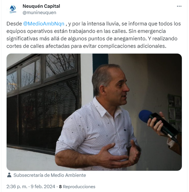 A su vez, precisó que en una hora y media de lluvia cayeron más de 25 milímetros de agua. "Es mucho y de manera intempestiva", subrayó. El promedio histórico de acumulación de lluvia para febrero en Neuquén es de 12.6 mm.