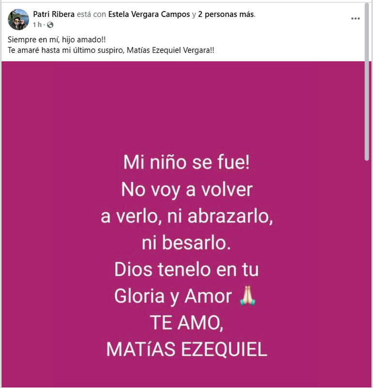 "Mi niño se fue! No voy a volver a verlo, ni abrazarlo, ni besarlo. Dios, tenelo en tu gloria y amor. TE AMO, MATÍAS EZEQUIEL", escribió su madre en Facebook, en un mensaje desgarrador.
