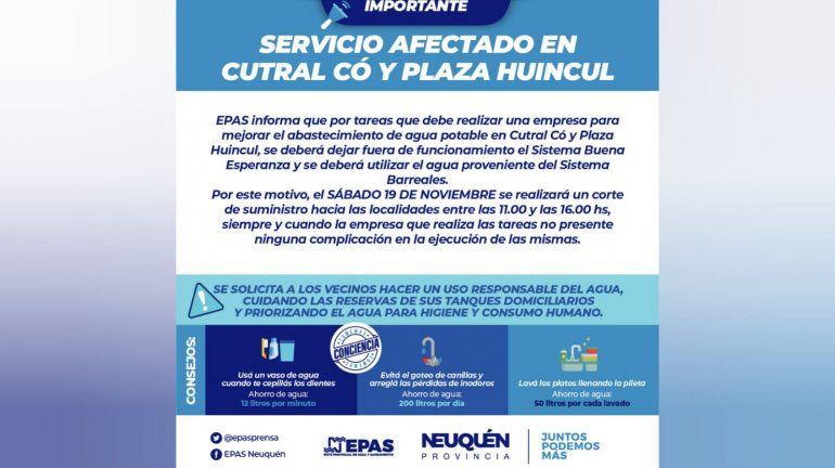 Por esta razón se deben realizar cortes de suministro de agua potable hacía las ciudades de Cutral Co y Plaza Huincul desde las 11.00 hasta las 16.00. El organismo provincial no descarta que la falta de agua se prolongue un poco más en caso de que la empresa a cargo de los trabajos presente complicaciones en la ejecución de las tareas.