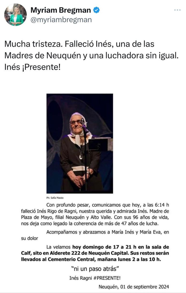 Myriam Bregman, ex diputada por el Frente de Izquierda y de los Trabajadores, tenía una llegada cercana a Ragni, en distintas visita que hizo a la provincia de Neuquén y escribió en su cuenta de X (Ex Twitter). "Mucha tristeza. Falleció Inés, una de las Madres de Neuquén y luchadora sin igual. Inés ¡Presente!", escribió "La Rusa", dirigente del Partido de los Trabajadores socialistas (PTS).
