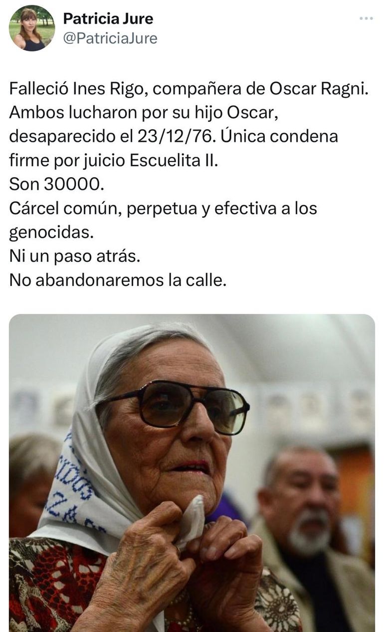 Patricia Jure, ex diputada provincial por el Frente de Izquierda y de los Trabajadores y militante del Partido Obreros, también dejó un mensaje en las redes sociales por el hondo pesar por la muerte de Ragni. "Falleció Inés Rigo compañera de Oscar Ragni. Ambos lucharon por su hijo Oscar, desaparecido el 23/12/76. Única condena firme por el juicio Escuelita II. Son 30000", recordó Jure.
