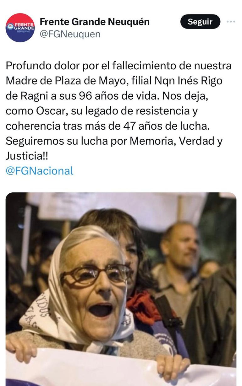 También el Frente Grande se expresó por el fallecimiento esta mañana de la histórica luchadora de Madres de Plaza de Mayo Filial Neuquén y Alto Valle. "Profundo dolor por el fallecimiento de nuestra.Madre de Plaza de Mayo, filial Nqn Inés Rigo de Ragni a sus 96 años de vida. Nos deja, como Oscar, su legado de resistencia y coherencia tras más de 47 años de lucha.¡Seguiremos su lucha por Memoria, Verdad y Justicia!", expresaron desde el partido.