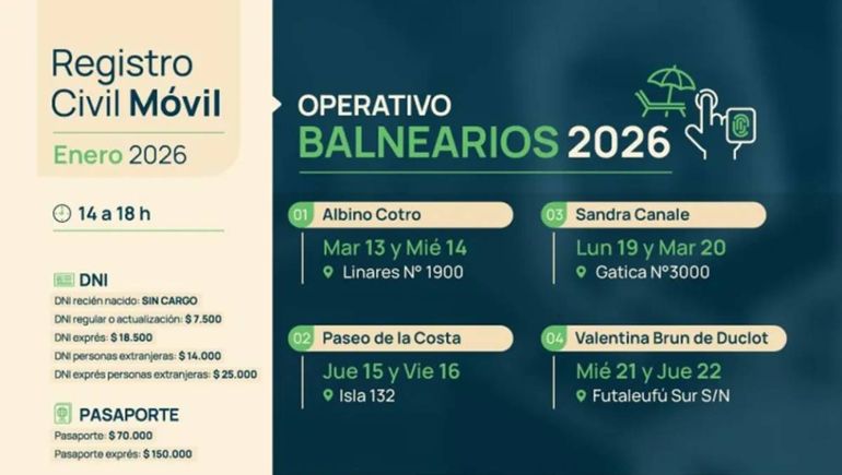 La dirección provincial del Registro Civil, dependiente del Ministerio de Gobierno, Mujeres y Derechos Humanos, llevará a cabo un operativo especial con la unidad móvil que recorrerá distintos balnearios de la ciudad de Neuquén desde el 13 hasta el 22 de enero inclusive.