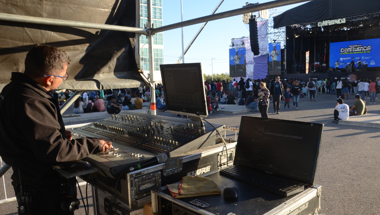 "Las jornadas son largas, empezamos con las pruebas de sonido a las 11 y terminamos a la medianoche cuando termina el espectáculo", contó el sonidista, quien ya había estado haciendo sonido en la feria del Libro y también en el pre Confluencia por lo que ya conocía el fuerte viento que corre en esta ciudad.