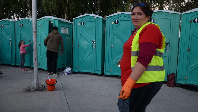 Lucía es una de las personas que se dedica a limpiar los baños químicos que están distribuidos por todo el predio. En su caso entra a las 16 y se queda hasta las dos de la madrugada.