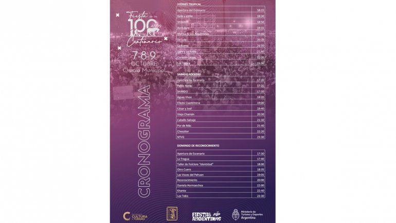 El domingo a partir de las 17:30 se presentará el grupo La Tregua, luego será el turno del Taller de Folclore "Identidad"; Otro Cuero y Las Voces del Pehuen. A las 20 tendrán lugar los reconocimientos a Pioneros y Pioneras de Centenario. Posteriormente regresará la música al escenario mayor con la presencia de Daniela Hormaechea; Khanto; y el gran cierre vendrá de la mano de Los Tekis.