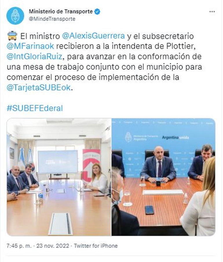 “La incorporación de Plottier a SUBE es una excelente noticia para las y los vecinos de la localidad que van a poder pagar sus boletos de forma más moderna, viajar de manera más ágil y segura, y quienes más lo necesiten van a poder acceder a la tarifa social del transporte, con descuentos del 55% en la tarifa", aseguró el ministro nacional.
