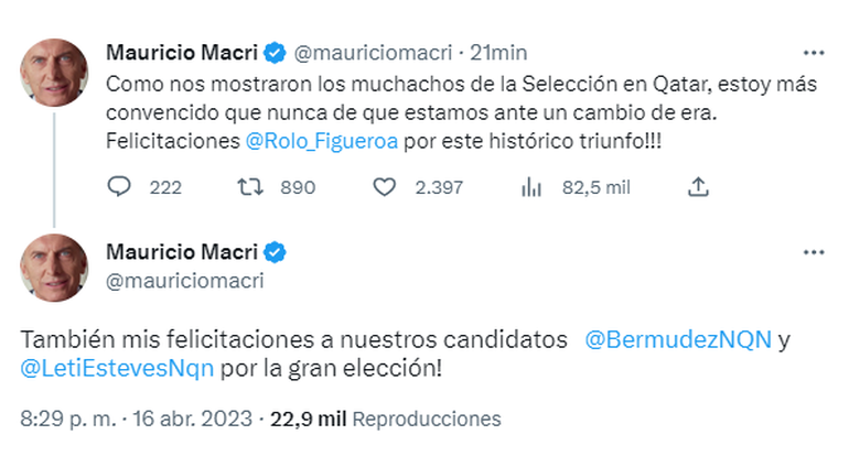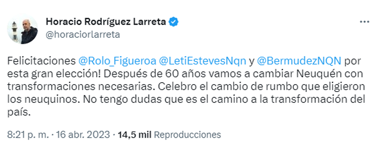 Por su parte, el candidato a presidente también uso Twitter y expresó: "Felicitaciones Rolando Figueroa, Leticia Esteves y Marcelo Bermúdez por esta gran elección! Después de 60 años vamos a cambiar Neuquén con transformaciones necesarias. Celebro el cambio de rumbo que eligieron los neuquinos. No tengo dudas que es el camino a la transformación del país".