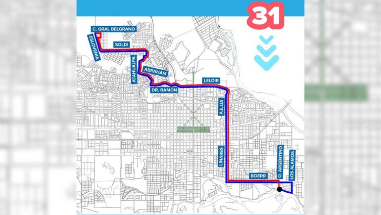 La línea 31 tendrá una de sus cabeceras en el cruce de Crucero General Belgrano y Eslovenia, en la zona del Distrito 5, en la meseta neuquina. Continuará por Soldi, Atahualpa Yupanqui, Abraham y luego tomará el corredor Dr. Ramón - Leloir. Continuará luego por el corredor Illia - Linares para doblar en Boerr y llegar hasta Obrero Argentino y Los Álamos, justo donde se encuentra el mirador a orillas del río Limay, en el Paseo Costero Limay.