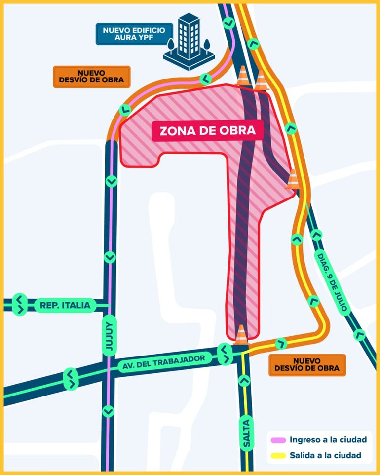 En tanto, aquellos automovilistas que ingresen a la ciudad desde Ruta 7 (Avenida Alfonsín), deberán desviarse a la altura del nuevo edificio Aura YPF y no podrán conectar con la calle Avenida del Trabajador. En cambio, deberán girar a la derecha por el desvío dispuesto, que conecta con la calle Jujuy y, desde allí, sí podrán circular por República de Italia o por Avenida del Trabajador.