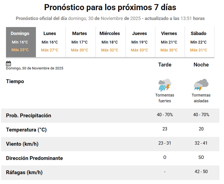 El pronóstico oficial del Servicio Meteorológico Nacional, actualizado a las 13:51, confirma que la inestabilidad seguirá al menos hasta esta noche. Para la tarde se esperan tormentas fuertes, con una probabilidad de precipitación del 40 al 70%, ráfagas que podrían superar los 30 km/h, y una máxima de 23°C.