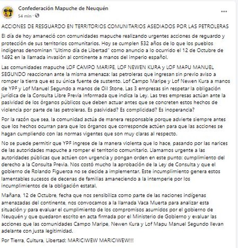 Desde la Confederación Mapuche de Neuquén alentaron las acciones de resguardo "en territorios comunitarios asediados por las petroleras", en apoyo a las comunidades Campo Maripe, Newen Kura y Mapu Manuel Segundo.