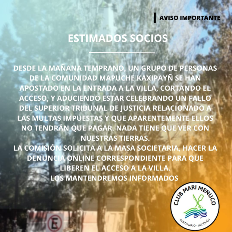 Los mapuches de la comunidad Kaxipayiñ lanzaron un “festejo por seis días” por el fallo favorable del Tribunal Superior de Justicia (TSJ), con un bloqueo en el portal de acceso a la villa del Club Mari Menuco. Varios de los socios que intentaron ingresar a la villa turística y albañiles que trabajan todos los días, no pudieron ingresar. Incluso el expresidente del club, Roberto Rapaz, quedó atrapado dentro de la villa y reveló que no lo dejaban salir.