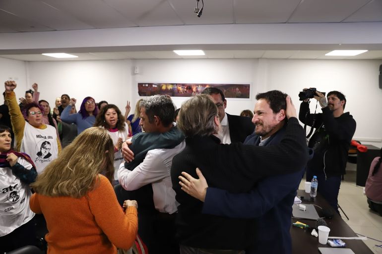 Marcelo Guagliardo se dio un abrazo que llegó hasta las lágrimas con Juan Villanueva, el marido de la docente Mónica Jara y con Marcela Altube, esposa del gasista Nicolás Francés, tras la lectura del fallo histórico que declaró culpables a cinco de los seis imputados por la explosión y muerte en la Escuela 144 de Aguada San Roque.