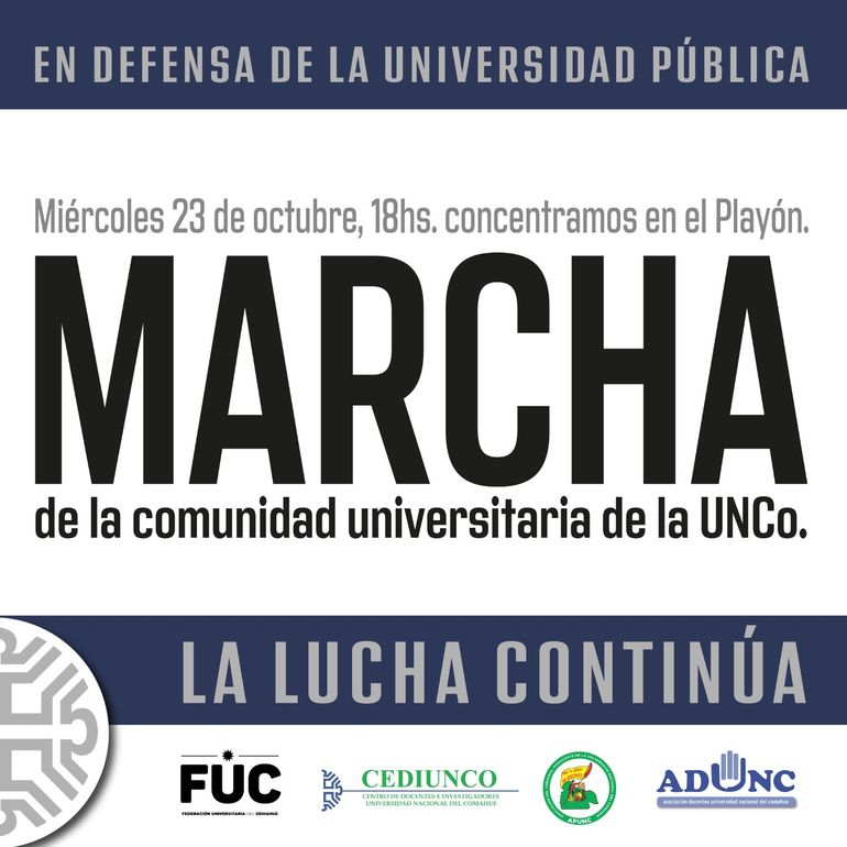 En el marco de una semana de distintas actividades en defensa de la universidad pública, se realizará una movilización convocada por la intersindical de los gremios de la UNCo. La marcha se realizará este miércoles a las 18 horas, con punto de concentración en el playón de la sede central, ubicada en el alto de Neuquén.