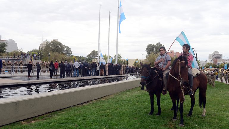 El acto comenzó pasadas las 9 con el izamiento de las banderas nacional, de Malvinas y la provincial, y la entonación de los himnos nacional y provincial. Tuvo el momento cúlmine con la colocación de ofrendas florales y un minuto de silencio en conmemoración a los caídos.