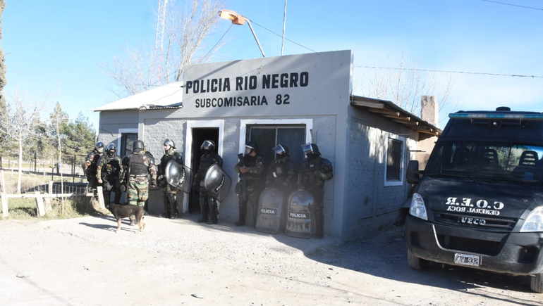 El piquete instalado por las fuerzas de seguridad, tanto de Neuquén como de Río Negro es una suerte de cordón para no dejar ingresar personas hasta que termine el operativo, ordenado por el fiscal de Cipolletti, Gustavo Herrera.