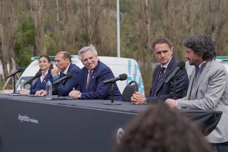 Antes del acto, el presidente Fernández y el gobernador Gutiérrez recorrieron el inicio de la pavimentación de la Avenida Los Lagos, entre el empalme con la Ruta Nacional 40 y la calle Cerro Azul, en el barrio Cordones de Chapelco.