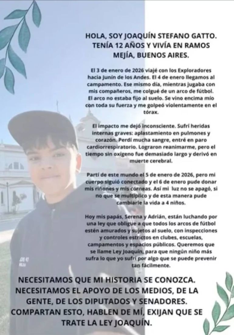 Además, lanzaron una campaña de visibilización en redes sociales bajo el nombre “Ley Joaquín”, con el objetivo de sumar adhesiones y concientizar sobre la importancia de la seguridad en instalaciones deportivas.