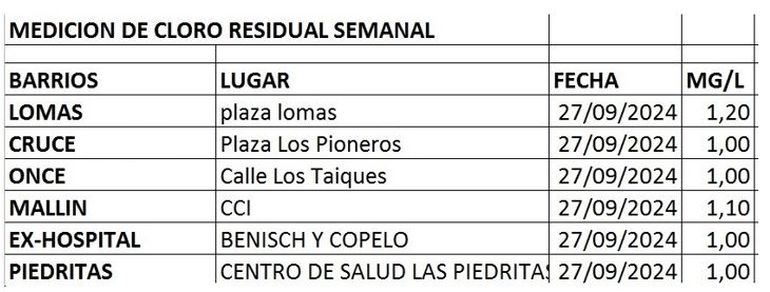Además, del laboratorio de Bromatología monitoreó los niveles de cloro residual en el agua de la red, arrojando una concentración adecuada de 1 mg/L en los barrios que dependen de este sistema. Se indicó que, con esta concentración de cloro, "se garantiza que no haya posibilidad de desarrollo de ningún tipo de bacterias patógenas, asegurando así la desinfección efectiva del agua distribuida".