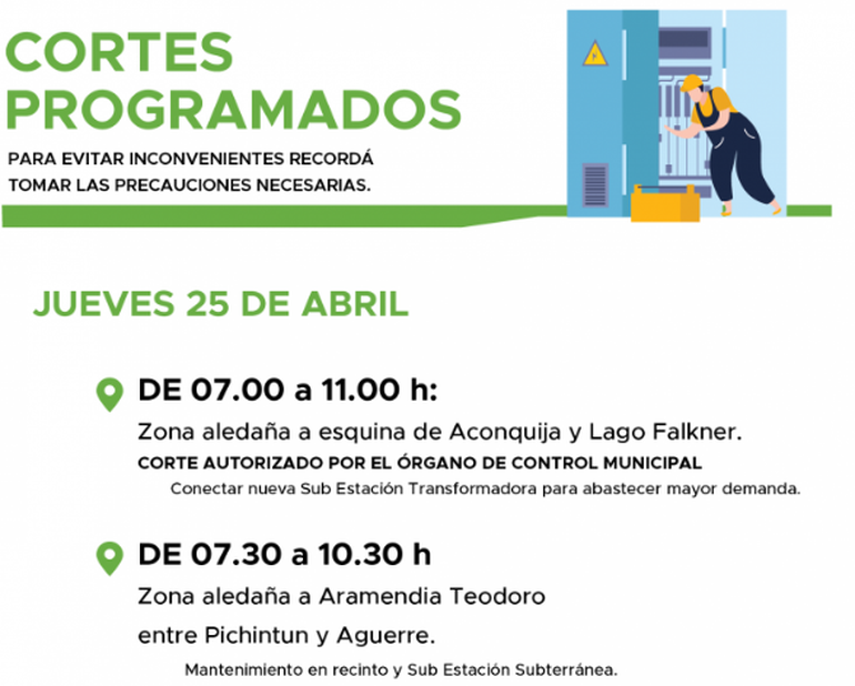 El primero de ellos iniciará a las 7 de la mañana del jueves y se extenderá hasta las 11, en la zona aleñada a la esquina de las calles Aconquija y Lago Falkner. Es una interrupción autorizada por el Órgano Contralor Municipal para instalar la nueva sub estación transformadora que abastecerá la mayor demanda del sector.
