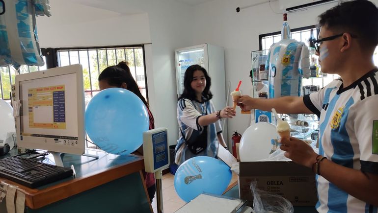 Por último, contó que están planeando sortear la gigantografía de Marcos Javier “el huevo” Acuña para la final del mundial. “Todo es con la idea de ser reconocidos como la esquina mundialera de Las Lajas. Hicimos toda la decoración de la heladería con la temática mundialera y vamos a seguir así”, concluyó.