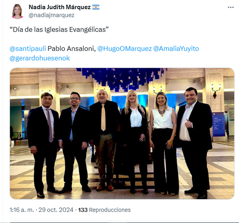 “Un placer volver a ver a Amalia Yuyito González en el acto de Aciera (Alianza Cristiana de las Iglesias Evangélicas de República Argentina), por el Día de las Iglesias Evangélicas”, escribió Márquez en su cuenta de X, quien se mostró junto a su padre.