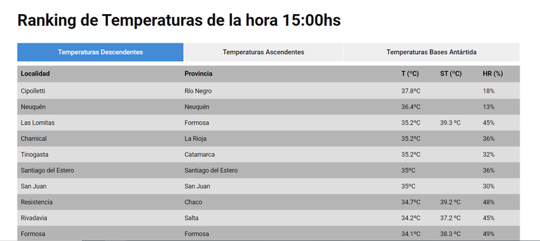 Para las 15 horas, la temperatura ya estaba en 36,4°C, y Neuquén era capital más calurosa de todo el país. Cipolletti era la ciudad más calurosa con 37,8°C, según el reporte del SMN.