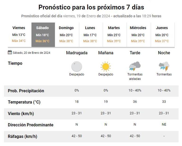 Según el pronóstico dominical, del mismo organismo, la temperatura podría alcanzar los 38° con una mínima de 20°. Al igual que el sábado, se prevén tormentas aisladas hacia la noche.