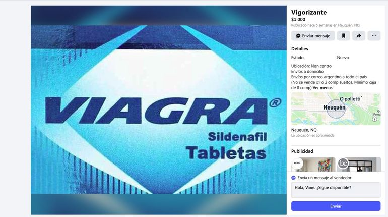En un recorrido por el Marketplace de Facebook en Neuquén la venta de viagra por ese medio llama la atención. Una publicación con ubicación en Neuquén Centro ofrece este producto con una compra mínima de una caja con 8 comprimidos.