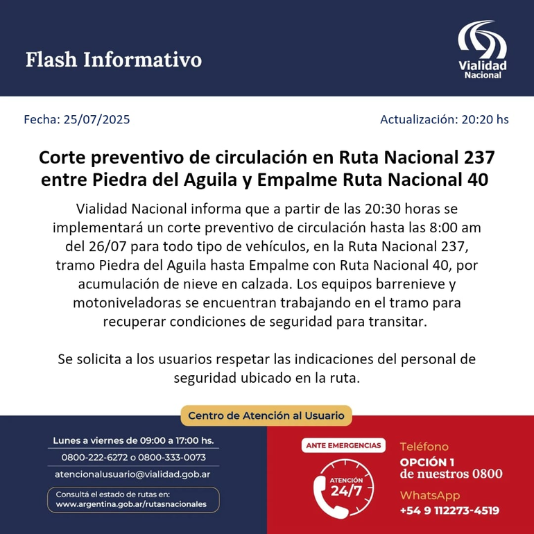 Además, se informó desde Vialidad Nacional del corte preventivo de circulación de 20 a 8 del sábado 26 de julio de la Ruta 237 entre Piedra del Águila y Empalme Ruta 40.